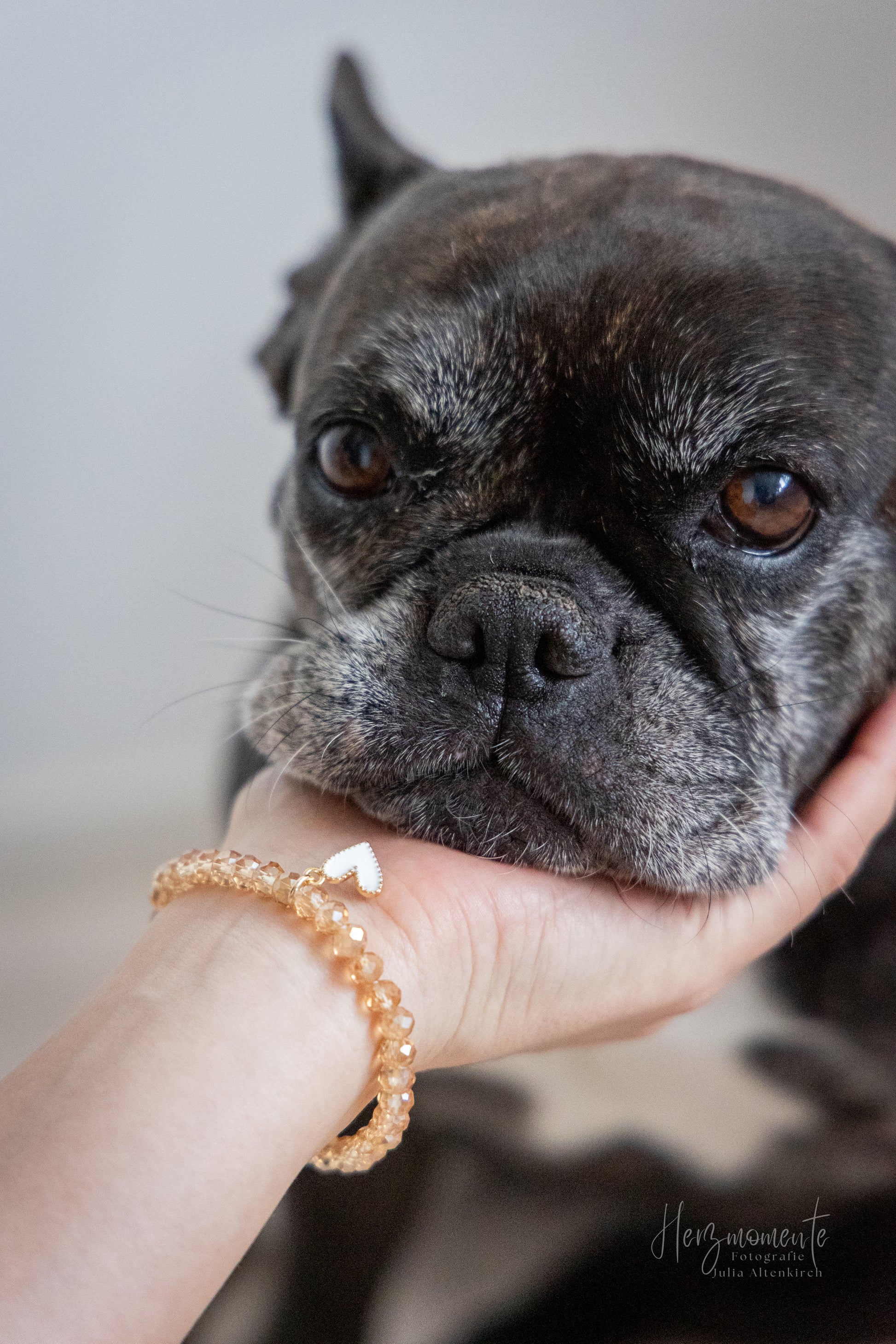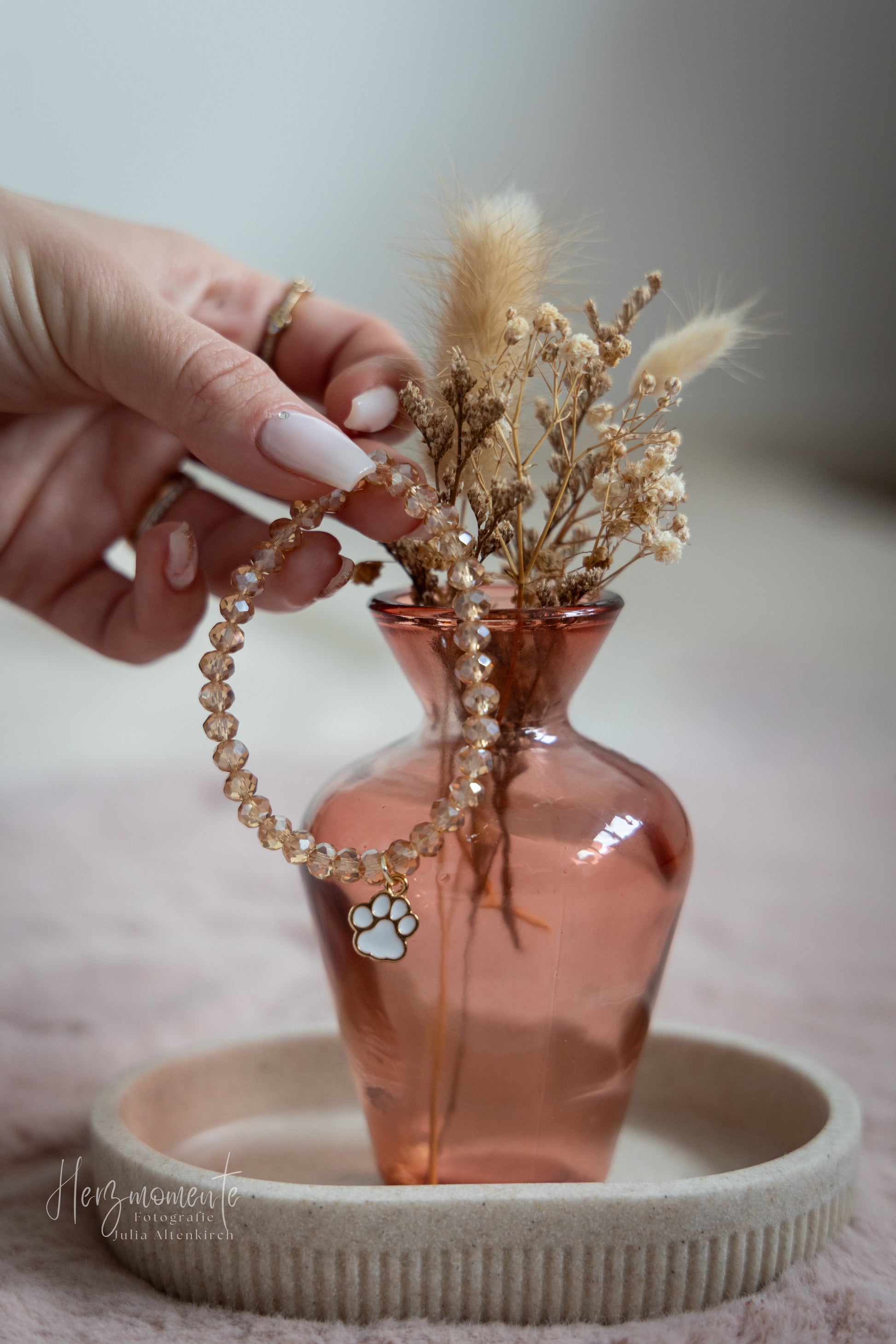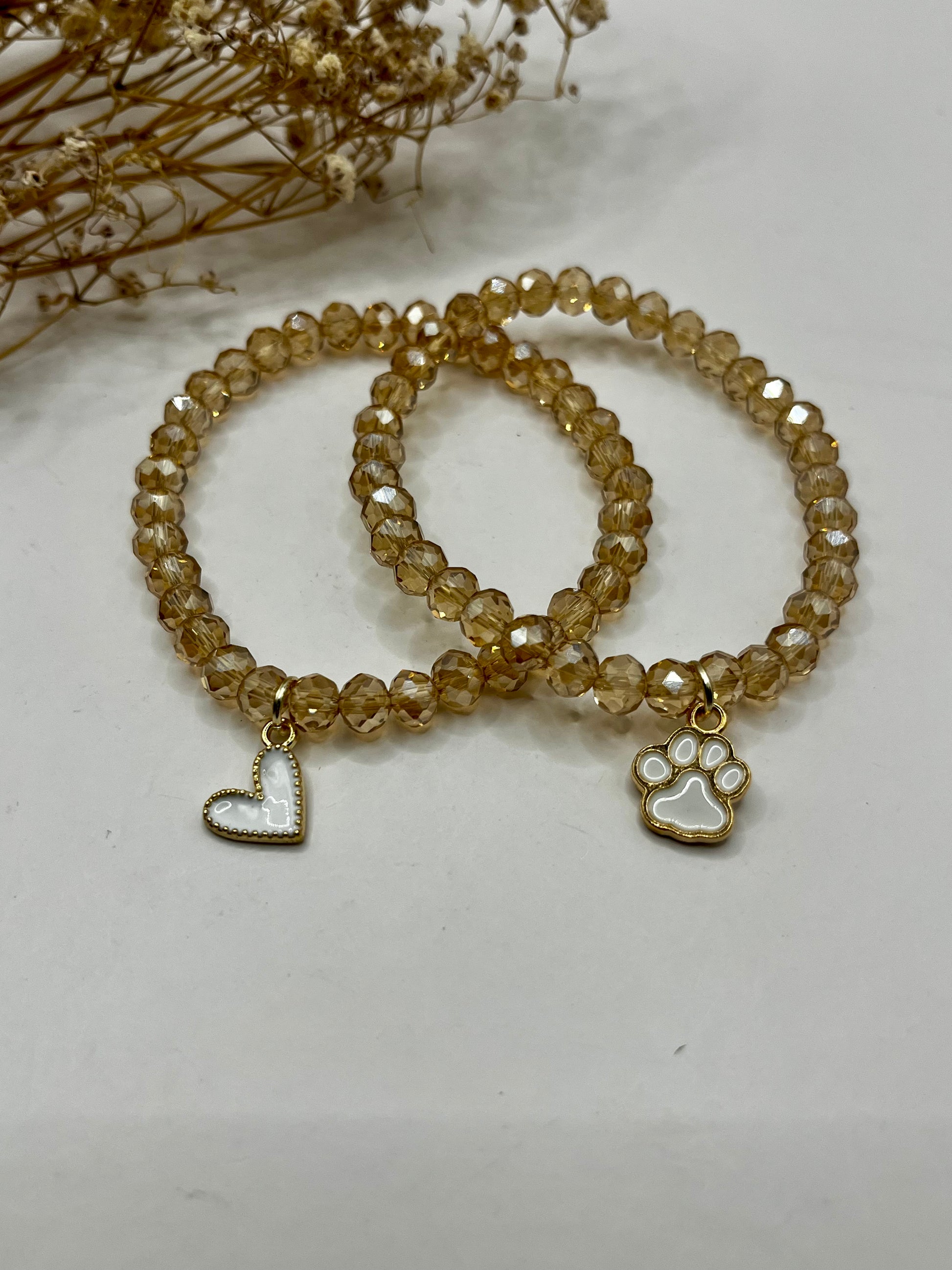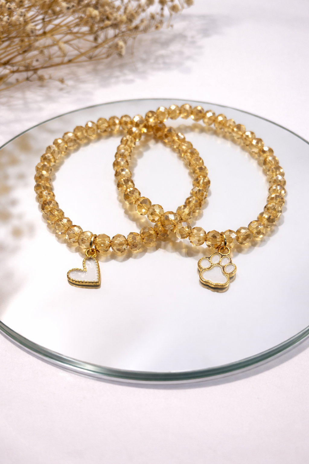 Mit seinen funkelnden goldenen Kristallperlen und den zarten Anhängern – wahlweise ein weißes / rotem Herz oder eine weiße Pfote – steht es für Liebe, Mitgefühl und die besondere Verbindung zwischen Mensch und Hund.